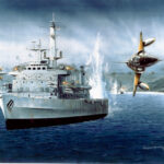La bomba de Mir González dirigida al buque impacta en la popa sin alcanzarlo. La admiración del enemigo es por considerar que nadie se hubiera animado a pasar a 900 km por hora a esa altura y a esa distancia.