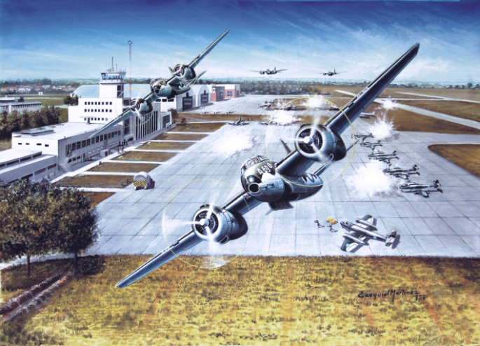 The painting shows the famous attack to the VII Brigade, home of the fighter interceptors when during an exercise the Calquin evaded the radar chain and the fighters and bombed the hangars and runway of Moron with bags of flour.